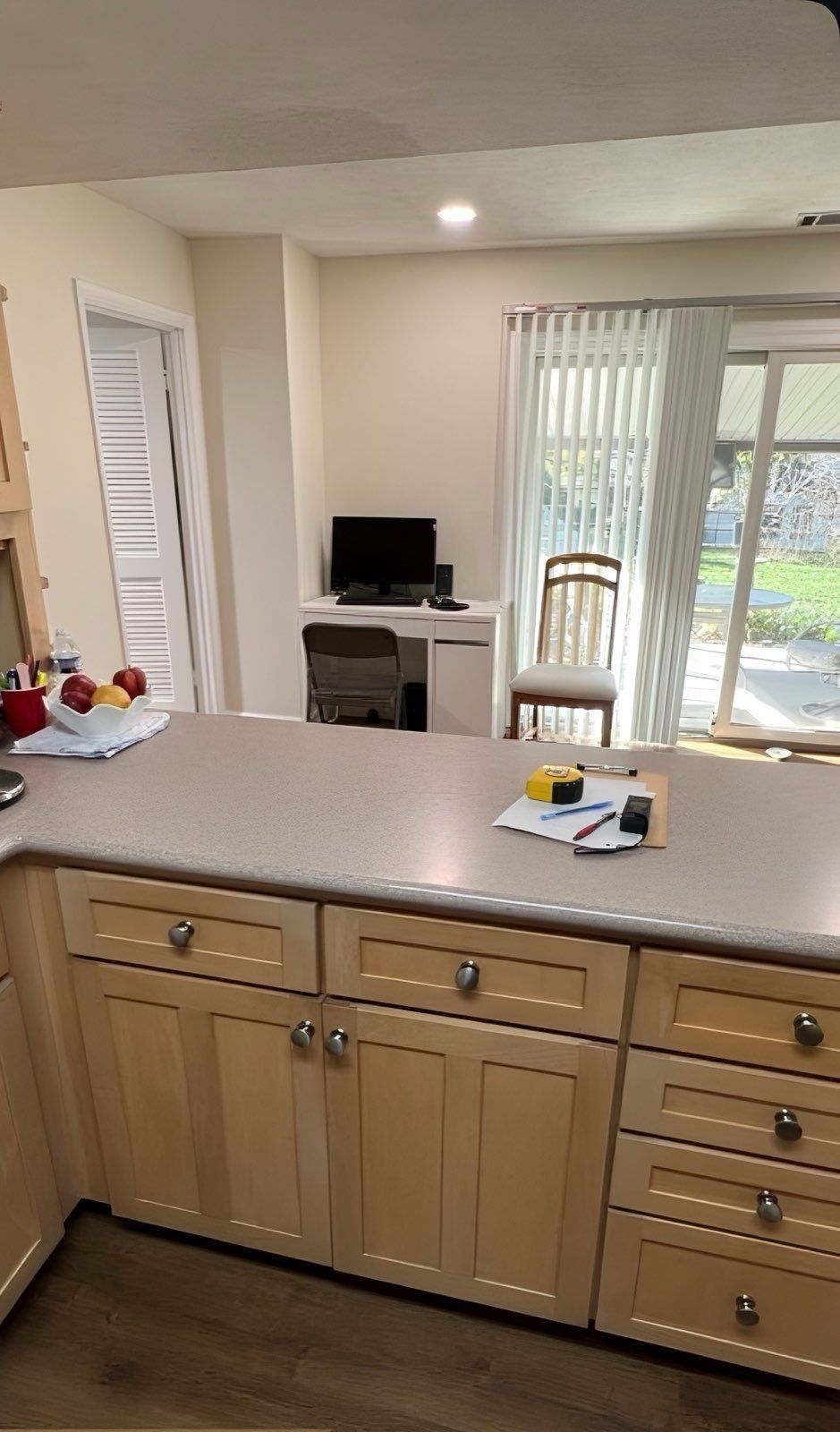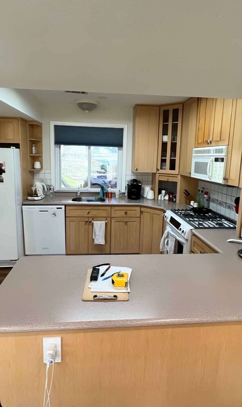 U-shaped kitchen with light wood cabinets, gray countertops, and a breakfast bar with black stools. A white refrigerator stands to the right.