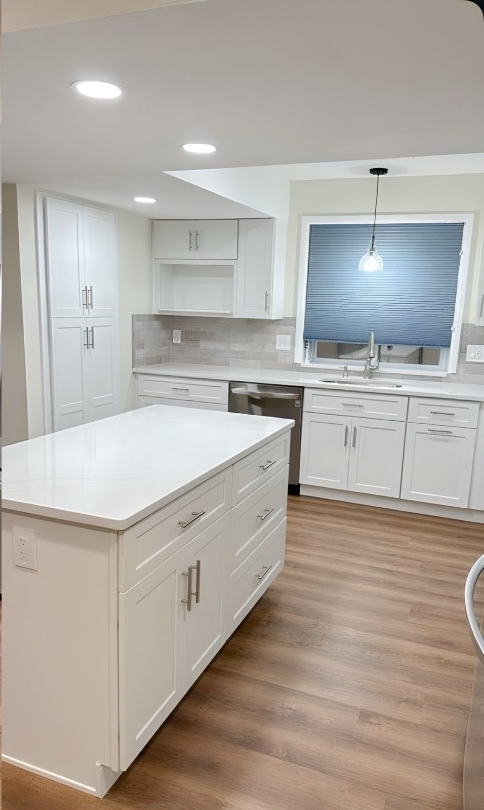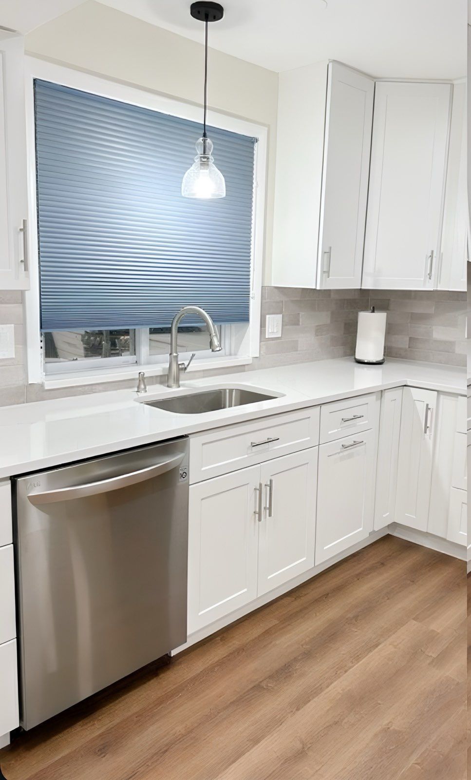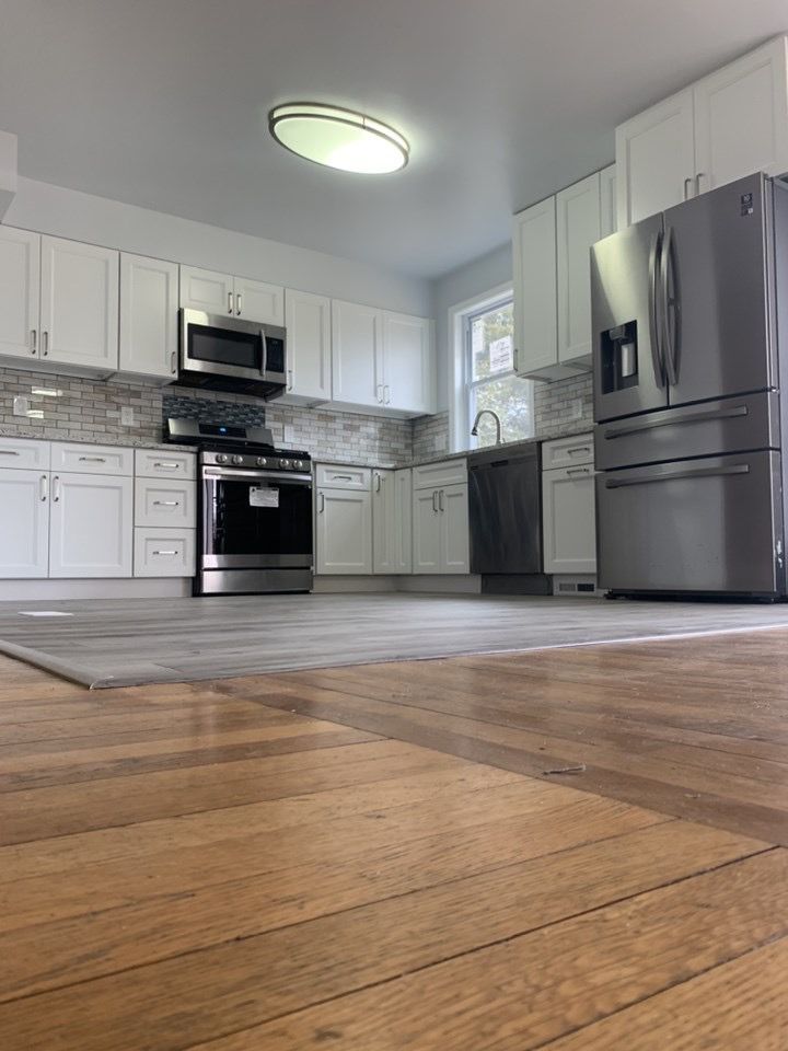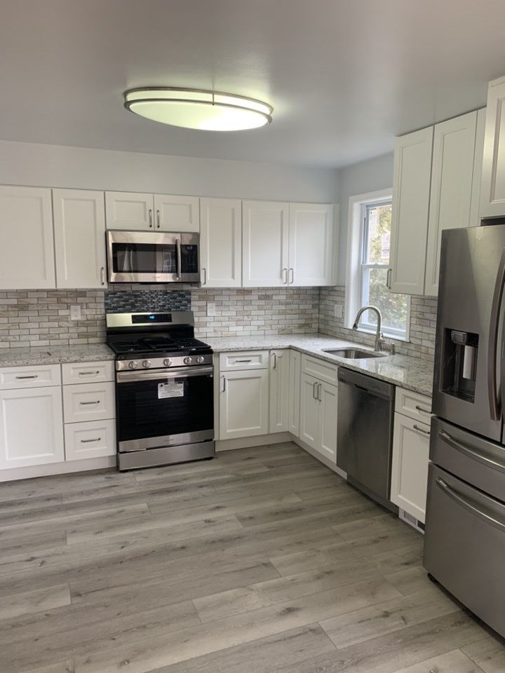 A newly renovated kitchen with white cabinets, stainless steel appliances, and wood flooring. The kitchen is well-lit and appears modern.