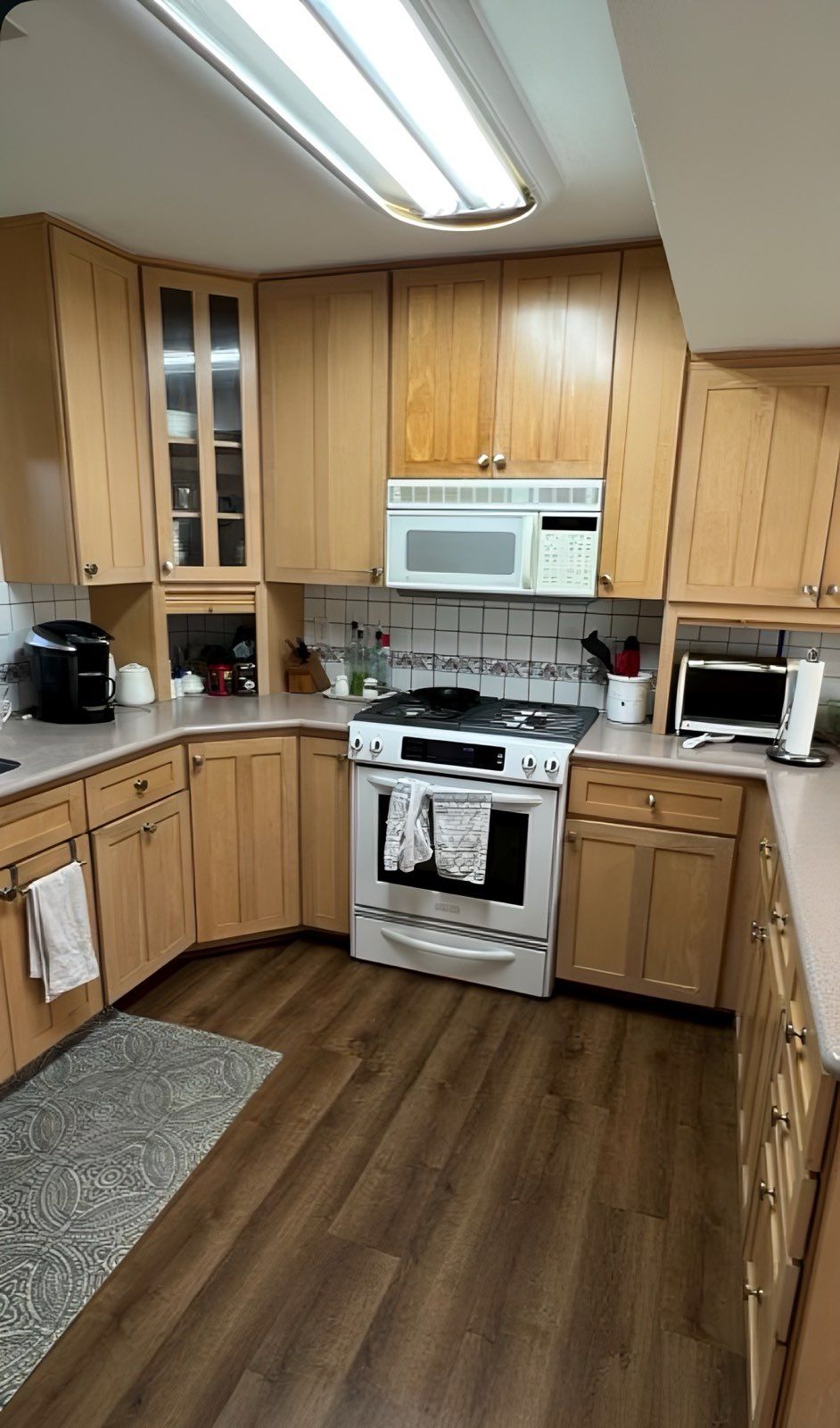 A kitchen with light brown cabinets, stainless steel appliances, and a granite countertop. Light brown wood-look flooring.